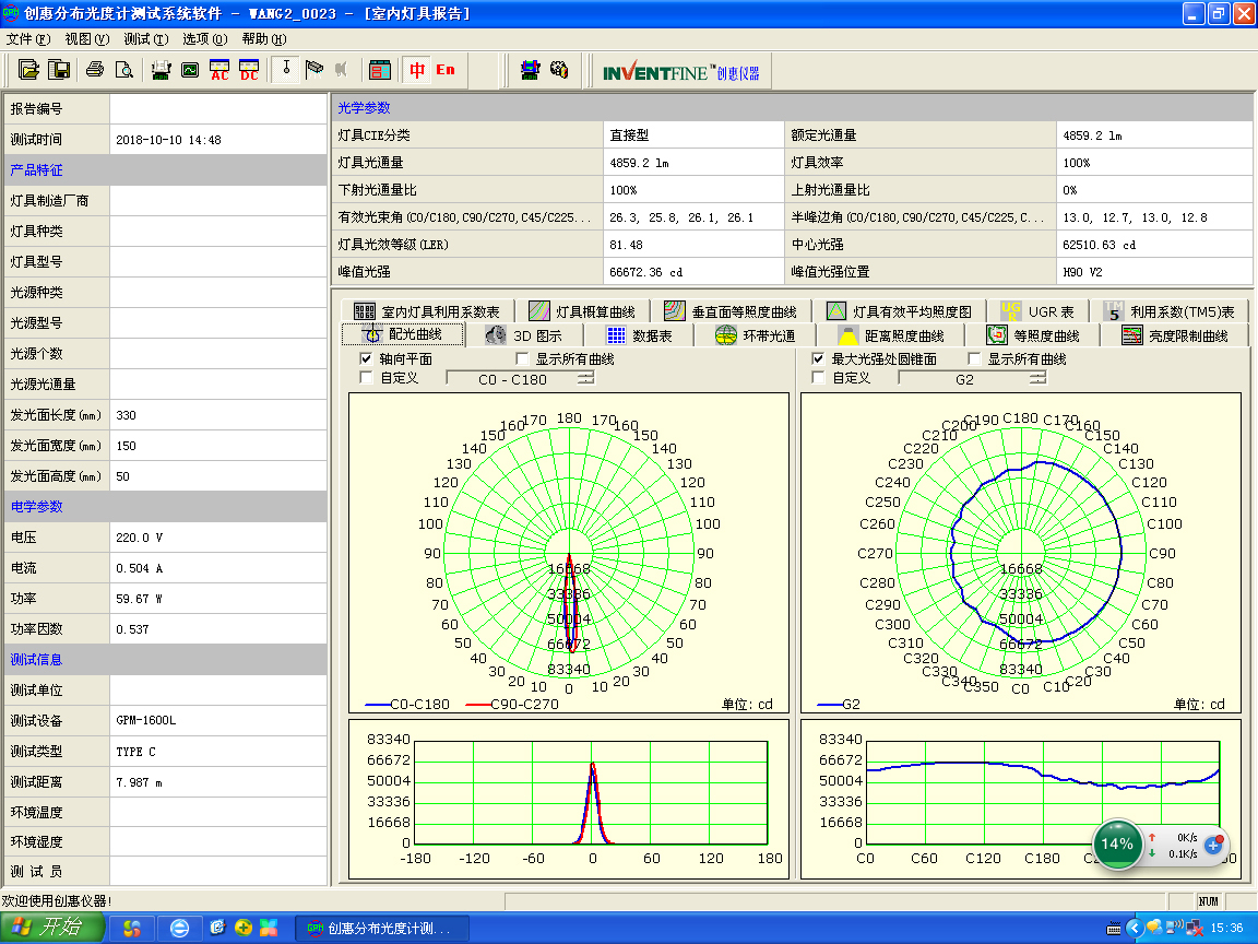 空間光強(qiáng)分布、任意截面上的光強(qiáng)分布曲線(xiàn)(可分別用直角坐標(biāo)系或極坐標(biāo)系顯示)、空間等光強(qiáng)曲線(xiàn)、平面等照度分布曲線(xiàn)、亮度限制曲線(xiàn)、環(huán)帶光通量、眩光等級(jí)、燈具效率、有效發(fā)光角、上射光通量、下射光通量、燈具總光通量、有效光通量 、利用系數(shù)以及通過(guò)創(chuàng)惠的數(shù)字電參數(shù)測(cè)量?jī)x同時(shí)實(shí)現(xiàn)電壓、電流、功率、功率因數(shù)等電性能參數(shù)測(cè)量,并生成完整的燈具光電性能參數(shù)報(bào)告。